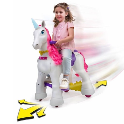 Сідайте на електричного єдинорога і катайтеся на ньому, завдяки поводам ви можете кермувати вперед і назад і повертати вліво і вправо. Єдиноріг оснащений ручкою, за допомогою якої його можна пересувати. Рупор має вбудований світлозвуковий модуль. У набір входить щітка і аксесуари для розчісування гриви.