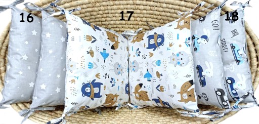 Кожна подушка має чотири зав'язки, завдяки яким ми можемо легко закріпити їх у ліжечку, вільно розташувати.
