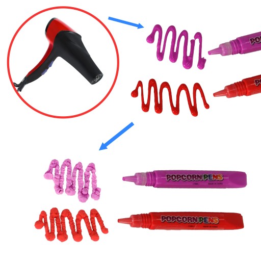 Закінчивши малювати свій малюнок, візьміть фен і спрямуйте тепле повітря фена на своє творіння. Через деякий час кольорові лінії почнуть «набухати» та збільшуватись в об’ємі, як кукурудзяне зерно, що перетворюється на попкорн. Таких видовищ ви точно ще не бачили!