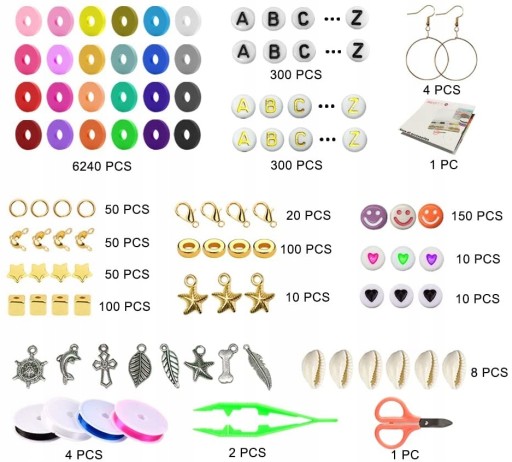 Пакет містить 2 коробки з 7200 різнокольоровими намистинами, шарми (намистини-листочки, смайлики, розпірні намистини, літери (повний алфавіт – звичайні та золоті літери), шарми, застібка з омарами тощо, 4 рулони стрейч-шнурів, ножиці, 1 пінцет.