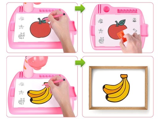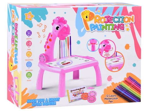 - Проектор-жираф має стільницю, на якій дитина може розставляти ручки та малювати та копіювати зображення, що відображаються на проекторі.
