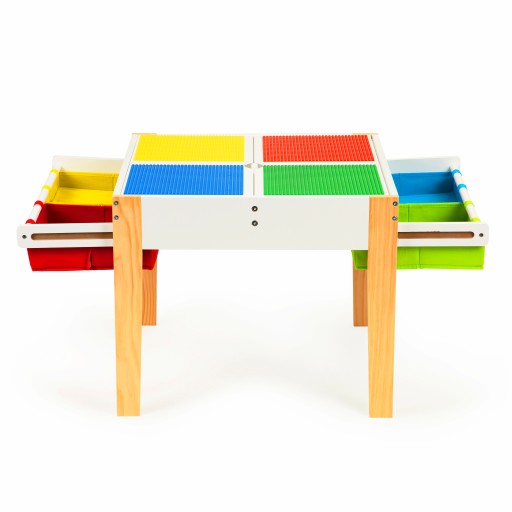Стільниця складається з 2-х знімних елементів. З одного боку — різнокольорові дошки для розкладання блоків, з іншого — плоска поверхня, на якій можна малювати, малювати та виконувати інші творчі ігри.