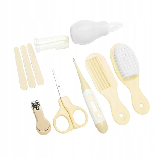 Поставляється з дитячою щіткою, гребінцем для волосся, машинкою для нігтів, пилкою для нігтів, ножицями, очищувачем для носа, термометром і зубною щіткою для пальців.
