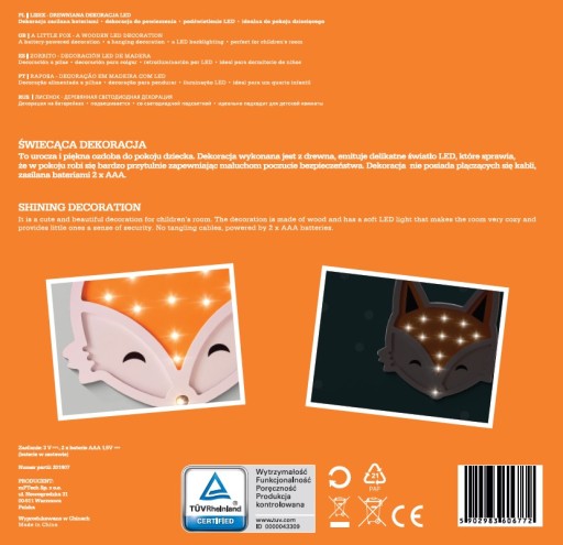 Світлова прикраса - це чарівна і красива прикраса дитячої кімнати. Прикраса виготовлена з дерева та випромінює ніжне світлодіодне світло, що робить кімнату дуже затишною та дає дітям відчуття безпеки. Прикраса не має сплутаних кабелів, живиться від батарейок.