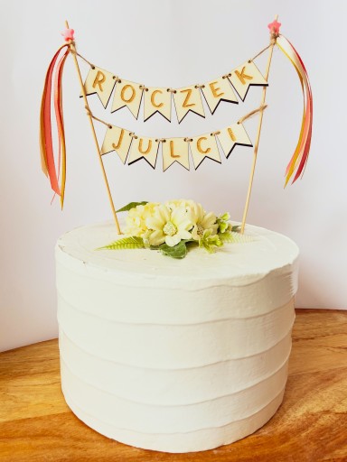Тортник з власним написом. Напис виконано дерев'яними прапорцями, підвішеними на джутову нитку. З боків різнокольорові золоті та бежеві стрічки та рожеві зірочки. Ми можемо зробити на ньому будь-який напис з двох слів :)