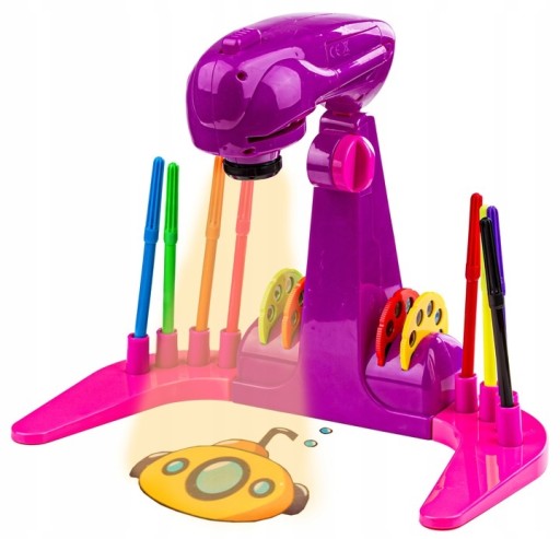 Іграшка має регульовану ручку-проектор, завдяки якій ви можете вільно встановлювати її висоту - це чудове рішення, завдяки якому дитина не закриватиметься і може задати малюнок "розміру". Проектор додатково має регульовану лінзу, завдяки якій ми можемо встановити фокус зображеного малюнка. Світло лампи проектора абсолютно безпечне.