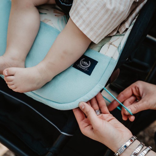 Вставка оснащена системою отворів для ременя, сумісною з більшістю колясок, і двома еластичними стрічками, які дозволяють прикріпити виріб за кілька секунд.