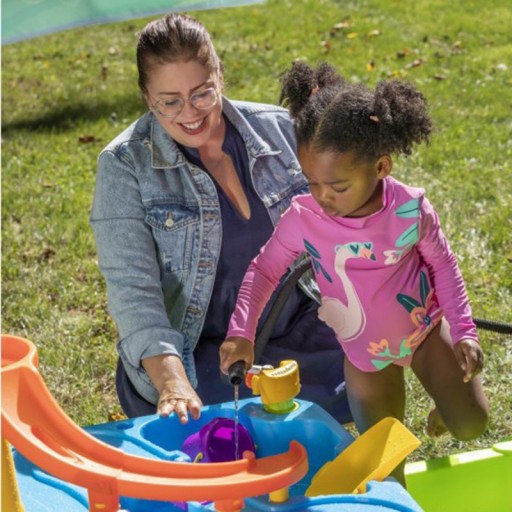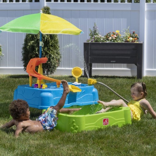 Цей столик для води 2 в 1 для дитячих ігор на свіжому повітрі містить велику парасольку, човни, пускові установки та рухомий носик, який служить системою для наливання води в басейн, розташований внизу. Басейн можна заховати під столом, щоб він займає менше місця, коли розвага закінчується. Верхня частина вміщує 15 літрів води, а нижня частина – близько 60 літрів.