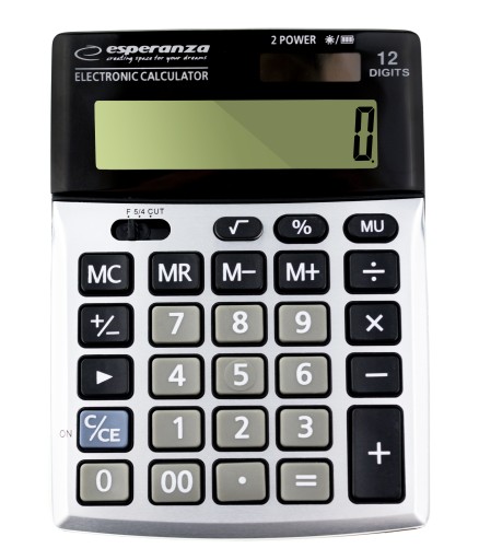 Настільний електронний калькулятор із великим 12-розрядним дисплеєм. Має всі основні математичні функції (додавання, віднімання, множення, ділення, виведення квадратного кореня, обчислення відсотків), функцію скасування введених цифр і можливість запам'ятовувати результати. Нахилений дисплей, великі цифри та великі клавіші полегшують роботу з калькулятором. Ідеально підходить для щоденного використання в магазинах і офісах.