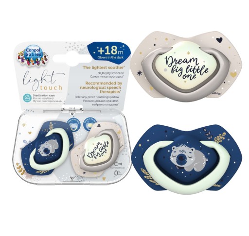 Пустушки Light Touch створені для максимального комфорту для найменших дітей. Їх винятково м’яка силіконова гума потребує менше зусиль під час смоктання, а легкий профільований диск не обтяжує прикус і гарантує вільне дихання, що, на думку спеціалістів, суттєво впливає на правильний розвиток ротової порожнини дитини.** Зручна ручка соски дозволяє прикріпити ланцюжок і полегшує керування дитиною. Світяться в темряві елементи - диск або ручка - полегшують пошук соски вночі. Ви можете легко підтримувати пустушки Light touch в чистоті завдяки сучасному футляру, який можна використовувати як для зберігання, так і для швидкої та зручної дезінфекції в мікрохвильовій печі. Досить трохи води та 2 хвилин, щоб пустушки були гігієнічно чистими. Пустушки Light Touch доступні в кількох унікальних колекціях, натхненних останніми тенденціями, і в різних розмірах - вони ростуть разом з вашою дитиною.