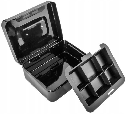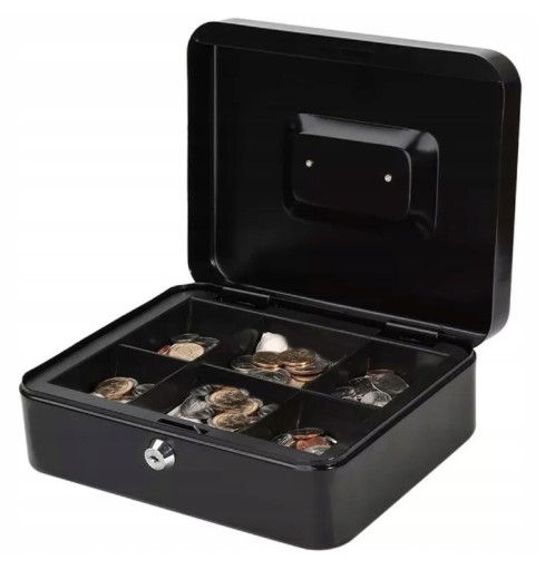 Металевий ящик із замком на ключ - відмінний спосіб зберігання дрібних і великих сум, документів та інших дрібниць. Оснащена полицею з відділеннями, завдяки якій ви зможете легко сортувати монети.