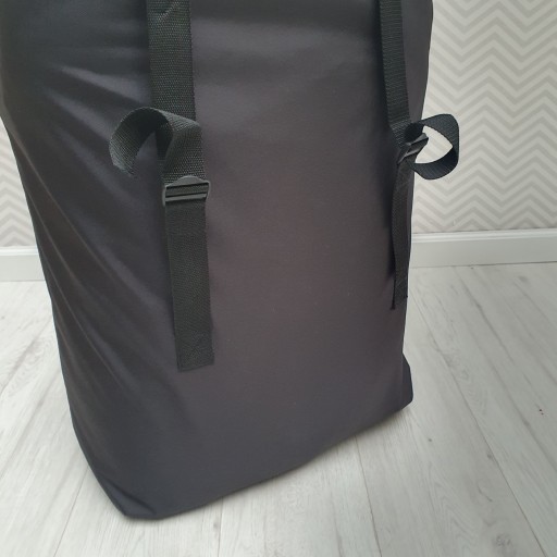 Чохол виготовлений з міцної і стійкої до механічних пошкоджень і погодних умов тканини (водонепроникний). Сумка закривається на шнурок зі стопором. Має міцні та регульовані лямки, які полегшать перенесення коляски (як рюкзак).