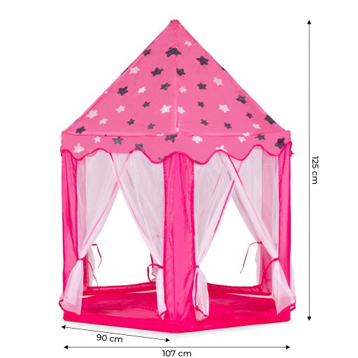 Кожна дівчинка - маленька принцеса, подаруйте їй сьогодні намет у вигляді барвистого палацу. Намет дозволить дитиніперенестись у казковий світ принцес.Тканинна підлога дозволяєвільна гра в саду або вдома,і це робить розкатний вхідвсередині намету повітря.