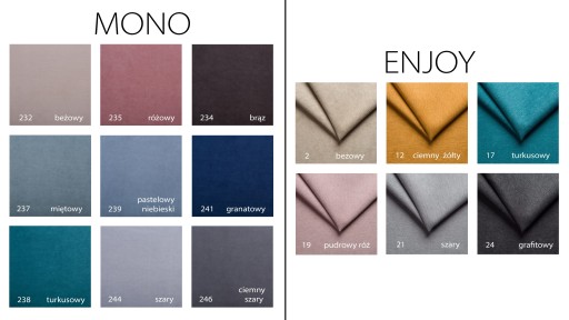 м'яка на дотик тканина з помітною структурою «ворсу». Він пропонує матові тони в широкій колірній гамі від бірюзового, через універсальний сірий, до модних пастельних відтінків. Матеріал дуже практичний і його легко підтримувати в чистоті - гідрофобне покриття обмежує проникнення пролитої рідини всередину тканини, дозволяючи її ефективно видалити, наприклад, м'якою тканиною або паперовим рушником.