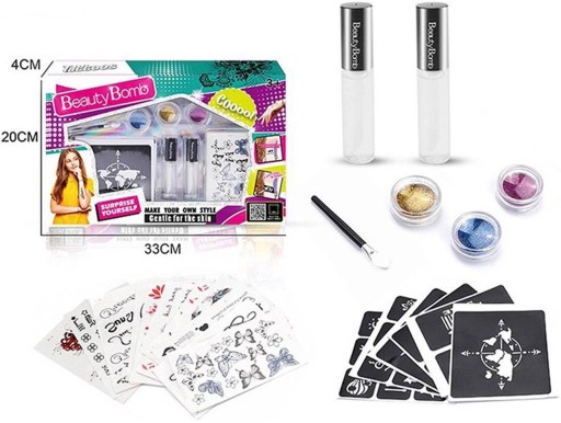 чудовонабір для татуювань,Який точно сподобається кожному підлітку. Наш набір включаєтатуюванняІводи, 3 кольорипудра з блискітками, клей-пудраі Âтрафарети для татуюваньСтворюватиунікальне татуювання.
