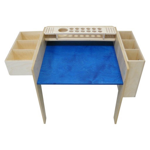 Набір складається зі столика і трьох органайзерів. Виготовлена з березової фанери товщиною 12 мм, покрита морилкою, а потім лаком. Меблі в яскравих кольорах чудово доповнять меблі дитячої кімнати, зроблять її інтер'єр теплим і життєрадісним. Стіл має три рівні регулювання: дитячий, малюк і старший. У набір входять органайзери для фарб, пензлі, чашки для води, кольорові олівці, фломастери та ручки, аркуші паперу та блоки. Завдяки їм вам не доведеться щоразу тягнутися до шухляди чи файлу – все під рукою. Нашими сортерами можна користуватися, поки діти граються – малюють чи малюють. Контейнери стійкі та практичні у використанні, а їх міцна конструкція забезпечує тривале використання. Кожну олівець можна вставити в окремий отвір, тому дитина легко вийме і поставить на місце.Набір чудово доповнить меблі дитячої кімнати, зробивши її інтер'єр теплим і веселим. Меблі функціональні та не займають багато місця. Ваша дитина знайде ідеальне місце для ігор, малювання та малювання та навіть їжі.