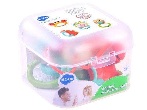У набір входить 5 різних брязкалець, упакованих в красиву оригінальну упаковку, яку можна зберігати після гри.