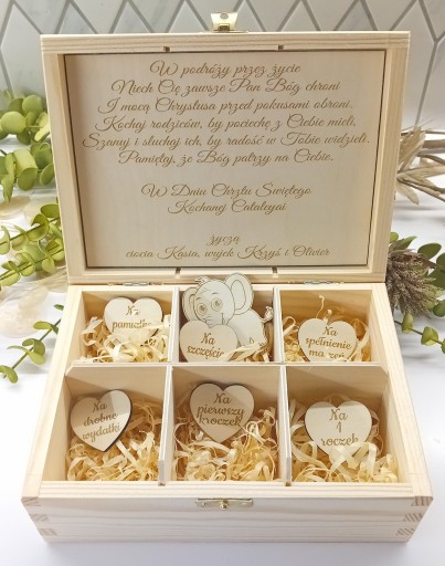 Дерев'яна коробка з відділеннями - унікальний подарунок на хрещення, рік або день народження. Персоналізація дозволяє зробити оригінальний подарунок на різні випадки життя. Подарунок стане сувеніром на довгі роки.