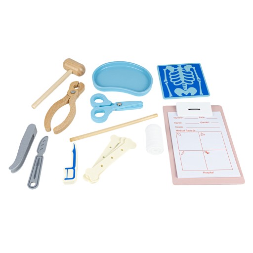 Нирка/лоток пластикова, елементи стетоскопа металеві. Решта елементів дерев'яні. Аксесуари великі і мають закруглені краї. Немає ризику, що ваш малюк пораниться або спіткнеться об якийсь предмет.