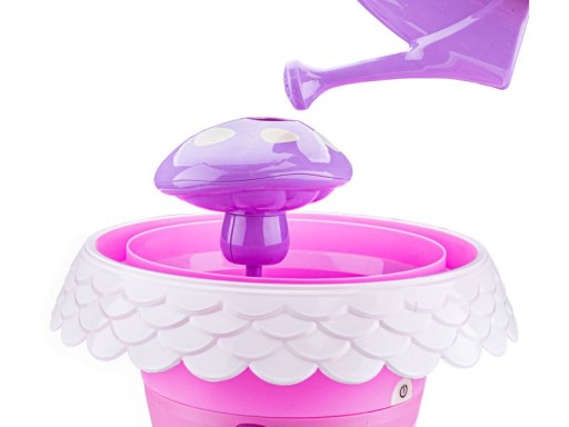 На верхній частині іграшки є гриб, який чудово полиє наші рослини. Просто налийте в нього води, щоб побачити справжній фонтан. Торець/рама верхнього горщика — це тунель, у який, наливши воду, ми побачимо подібний ефект. Вода стікає через 4 отвори і зрошує нижній рівень.