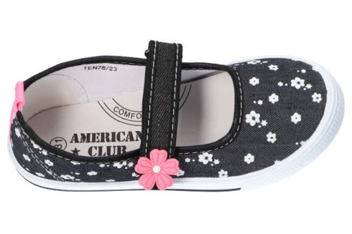 Дитячі кросівки American Club. Верх і внутрішня частина виготовлені з текстильного матеріалу. Устілка з натуральної шкіри. З декоративною гумовою квіткою. Застібається на липучку.