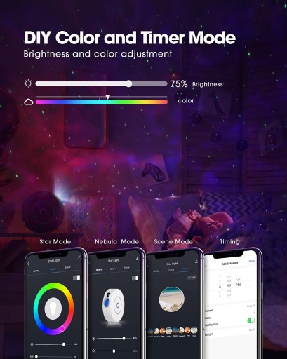 Цей проектор нічного неба можна підключити та керувати ним за допомогою програми «Smart Life» на вашому мобільному телефоні. Пристрій також сумісний з Google Assistant і Alexa в режимі Wi-Fi, звільняючи ваші руки та спрямовуючи вас до розумного життя. Навіть люди похилого віку та діти можуть це зробити без проблем, вмикаючи/вимикаючи проектор зоряного неба. Відрегулюйте яскравість або змініть колір голосом.