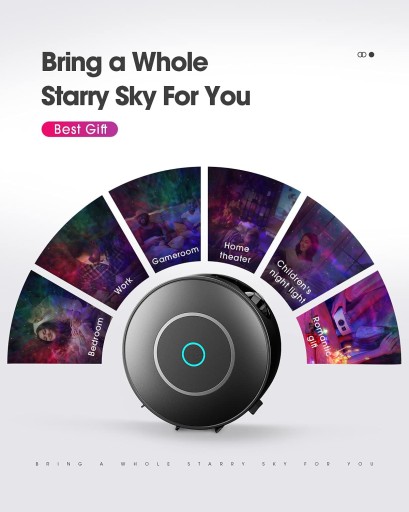 16 мільйонів кольорів і 4 тематичні програми - оновлена версія оснащена затемненням RGB і зміною декорацій. Ви можете створити власну зіркову хмару та швидкість хмари (синій, червоний, зелений і різні кольори градієнта) залежно від вашого настрою. Ви можете вибрати різні сцени та назву, колір сцени та швидкість зміни кольору. Він може займати 430 квадратних метрів. Зоряну хмару та зірки можна відображати окремо або разом.