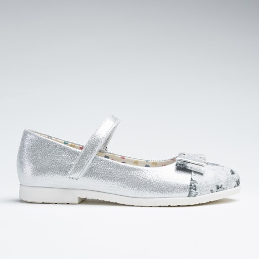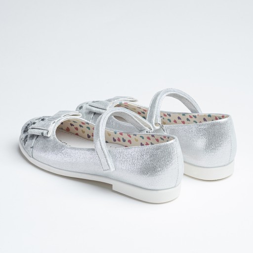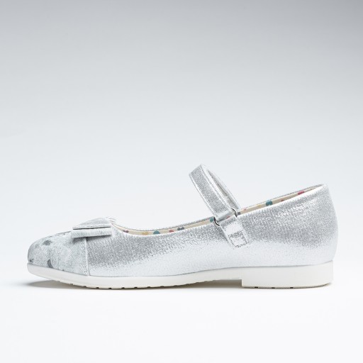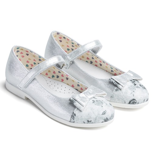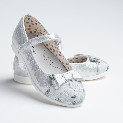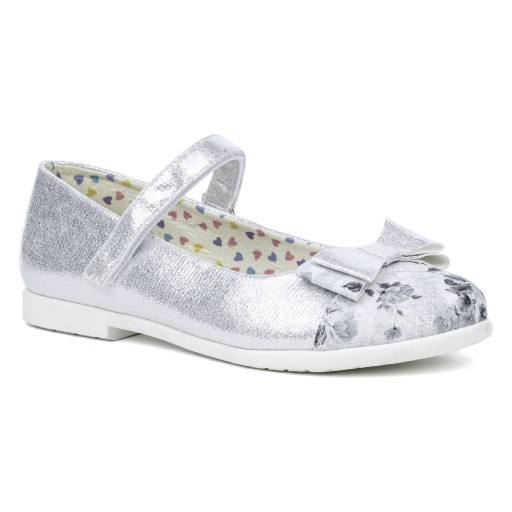 Дитячі балетки Wojtyko. Верх - екологічна шкіра, всередині - текстиль, устілка - натуральна шкіра. Прикрашена бантом і квітковим мотивом. Застібається на липучку.
