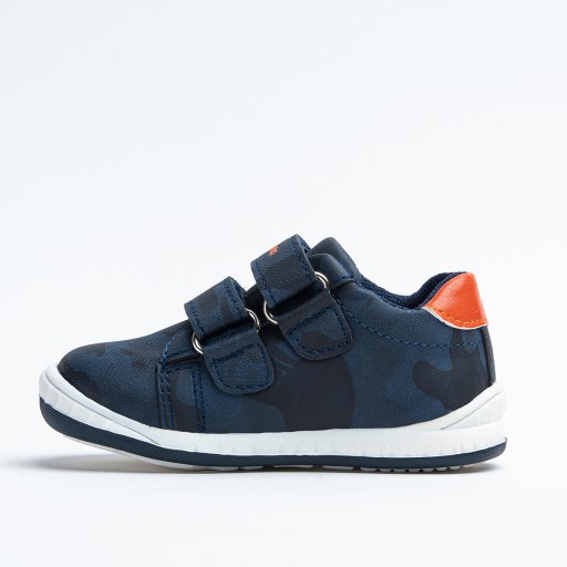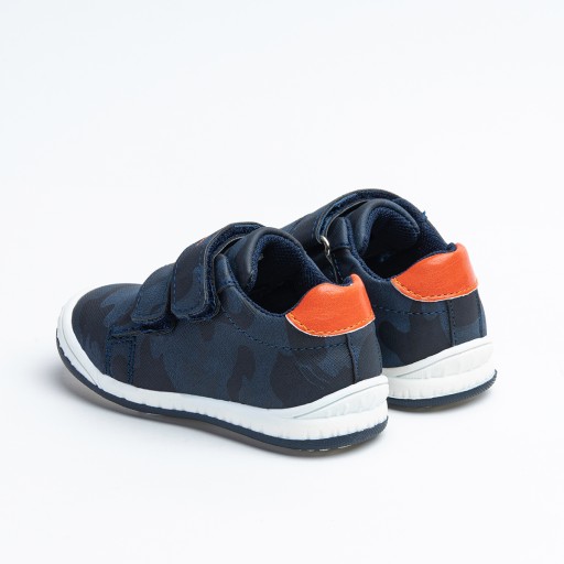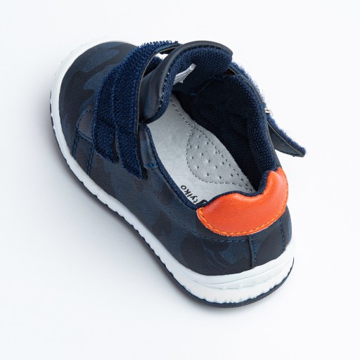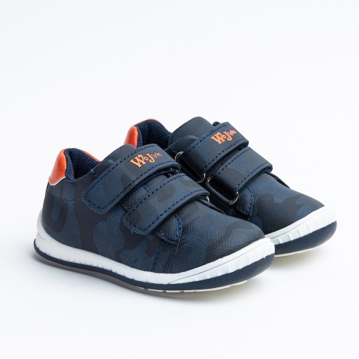 Дитяче спортивне взуття Wojtyśko. Верх виготовлений з екологічної шкіри, середина - з текстилю. Устілка натуральна шкіра. Прикрашений помаранчевими деталями та камуфляжним малюнком. Застібається на липучку.
