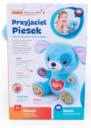 Кожен з них має вбудований перемикач і активує різні дії. Песик знає кілька красивих казок, вміє співати, рахувати від 1 до 5, знає букви, а також назви та звуки інших тварин. Коли вам захочеться відпочити після ігор, собака буде грати солодкі, солодкі колискові, які допоможуть вам заспокоїтися і розслабитися.