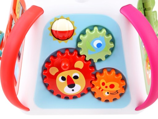 - площинка з котушкою - обертаючи ручку, малюк буде приводити в рух три шестерінки, на яких зображені тварини: лев, метелик і рибка