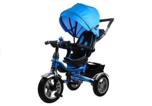 Великою перевагою представленого триколісного велосипеда єміцна синя рама. Увагу перехожих привернуть блискучі хромовані крила, розташовані над кожним із коліс, повністю розсувний купол із дахом, який захищає від різкого сонця чи вітру, у верхній частині якого є сітка, яка збільшує потік повітря. і м'який,Чохол на сидіння відповідного кольоруПідключається до джгутів і ременя безпеки.