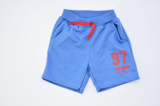 - Сині шорти. Широкий еластичний пояс і червона стрічка. На ніжці червоні написи. Дві кишені спереду.Такий спортивний комплект - ідеальний зручний одяг для літніх днів.