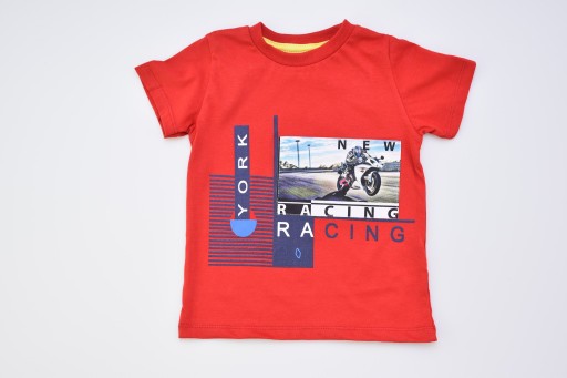 - Червона футболка з аплікаціями (написи та мотоциклетна графіка). Делікатна рубинка на шиї. Ви гладко.