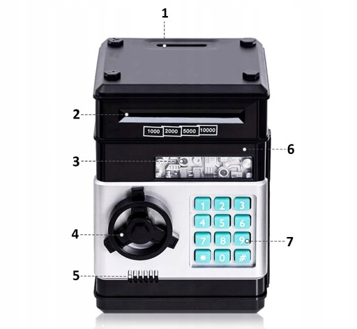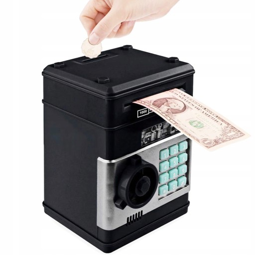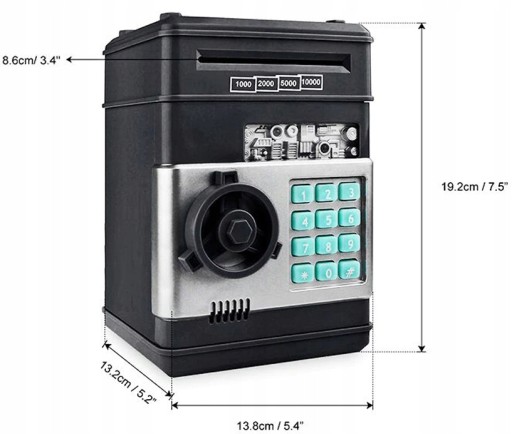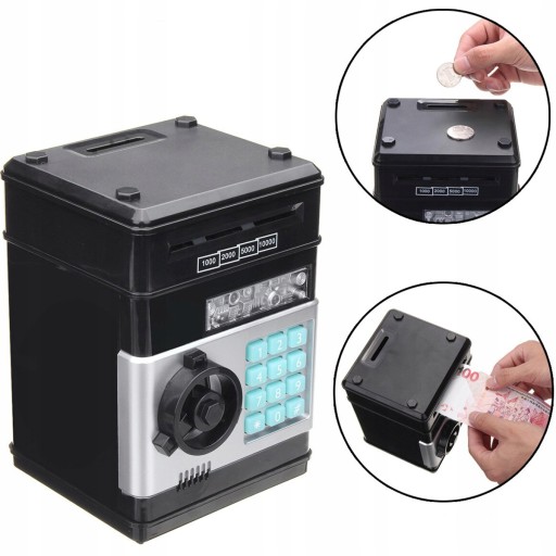 Через два спеціальні отвори в скарбничку можна вставляти як монети, так і банкноти. Вся справа закрита 4-значним кодом, придуманим власником сейфа. Продукт має нагадування про відкриті двері, щоб ви випадково не залишили доступ до своїх грошей.