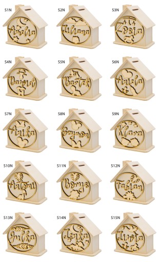Дерев'яна персональна скарбничка у формі будиночка - ідеальний подарунок для кожної дитини на будь-яке свято. На передній частині скарбнички дерев'яний декор з ім'ям дитини - на наших аукціонах ви знайдете багато візерунків на вибір!
