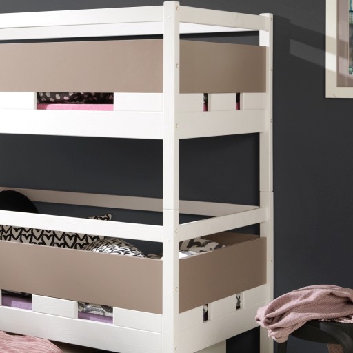 Кермо виготовлено з міцної деревини сосни та меблевого щита, покритого кромками ABS. Клієнти можуть вибрати колір деревини та колір дошки, щоб створити предмет меблів, який ідеально поєднується з дизайном інтер’єру. У вартість комплекту також входять каркаси з жорстких ламелей, а купити матраци відповідних розмірів можна на нашому сайті. Ruben Meblobed - функціональне двоярусне ліжко для сучасних дитячих і підліткових кімнат.