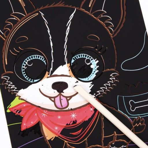 У набір входить 6 аркушів для дряпання з різними ілюстраціями собак і бамбуковий стилус для дряпання.