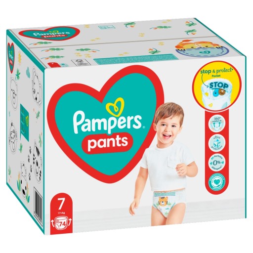 Штани підгузники PampersPants розміру 7 розроблені для дітей вагою понад 17 кілограмів. Малюки щодня освоюють нові навички, тому постійно рухаються – ходять, бігають, стрибають. Підгузки мають гнучку обробку, яка адаптується до тіла дитини, забезпечує комфорт і запобігає протіканню. Вони роблять прокручування простим і швидким. Підгузки Pampers Pants носять як нижню білизну. Їх заміна полегшується завдяки розривним сторонам і стрічкі.