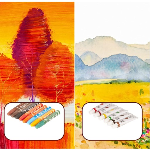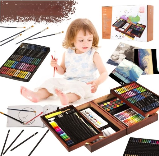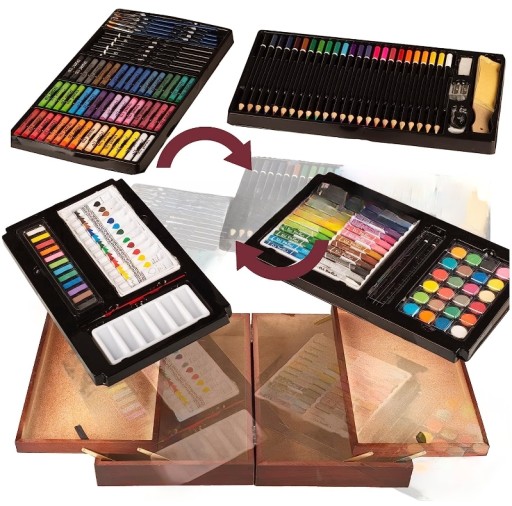 - Велика кількість матеріалів: 48 кольорових олівців, 24 олійні пастелі, 24 кольорові олівці, 12 олійних фарб, 36 акварелей та багато іншого.