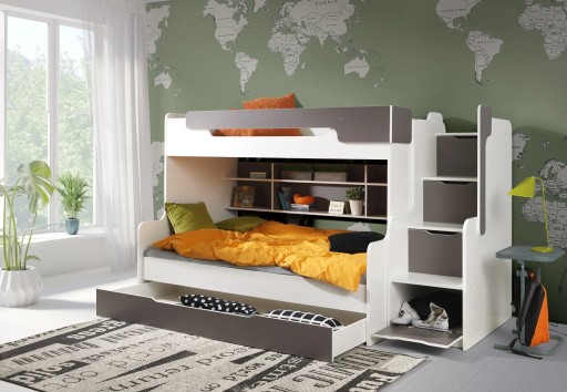 Це дуже функціональна конструкція з 3 спальними місцями. Це черговий варіант серії 3-місних двоярусних ліжок з нижньою спальною поверхнею розміром 120х200. Меблі мають трохи подовжене нижнє ліжко для двох осіб і верхнє ліжко для однієї людини. Між ними вузька полиця для книг і прикрас. Також під нижнім ліжком є великий ящик для постільної білизни. У підголівника є сходинки, які виконують роль полиці. Конструкція має вбудований підголовник і куточок, а також бічні балюстради з невеликими отворами.