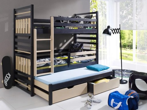 Сучасна і практична будівля на 3 спальних місця. колесо складається з нижньої та верхньої рами. Мають підголівники та підлокітники aura, а також бічні поручні з горизонтальних панелей. Є драбина, доступна з боку двох'ярусної. Під нижньою рамою знаходиться третє висувне ліжко, а під нею три висувні ящики, які пропонують додатковий простір для зберігання постільної білизни та одягу. Hipolit Meblobed - двоколірне колесо.При замовленні ви можете обрати колір рами та колір фурнітури.