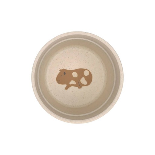 Усі елементи в дуже світлому меланжево-бежевому відтінку з барвистим малюнком, що імітує корм для домашніх тварин, і зображеннями цих істот на кожному з них. На тарілці — плямиста такса, на дні миски — блакитне плямисте кошеня, на дні чашки — плямиста морська свинка, на підставці для ложки — блакитний хвостатий зайчик.