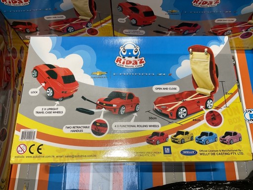 Валіза з логотипом Chevrolet - чудовий подарунок для маленького автолюбителя. Валіза в машину забезпечить дитині з раннього дитинства можливість самостійно користуватися своїми чотирма руками, а з Ridaz кожна подорож стане пригодою. Валізу можна використовувати в горизонтальному положенні (як іграшкову машинку на мотузці) завдяки ручці з тяговим ременем, який тягнеться від бампера, і 4 рухомим колесам, ремінь оснащений механізмом автопідзаводу. Його також можна використовувати у вертикальному положенні, як традиційну салонну валізу, тоді він пересувається на двох додаткових колесах. Найцікавіше, що з ним можна подорожувати літаком, поїздом і навіть носити особисті речі в школу чи садок. Продукт підіймає самолюбство маленького користувача, привертає до нього погляди друзів, і водночас викликає у кожного масу позитивних емоцій та посмішок! Це оригінально, практично, привабливо, все, чого чекає ваша дитина! Валіза закривається на два замки, розташовані на дверях автомобіля, всередині валізи є стрічки, застібки, кишені та відділення для зручності збереження порядку та упаковки. Упаковані в нього речі безпечно дістануться до місця призначення, а зручні відділення полегшать пошук речей.