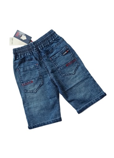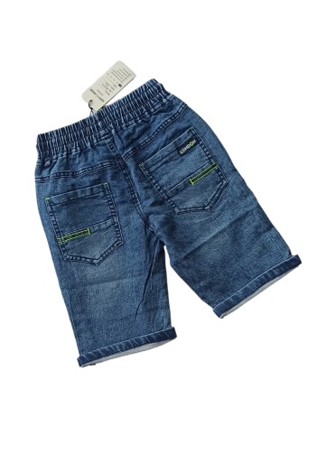 Дуже зручні короткі джинсові шорти. Для надягання - еластичний пояс і додаткова зав'язка. Спереду прорізні кишені, ззаду накладні кишені. Модні потертості.