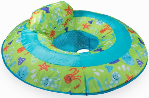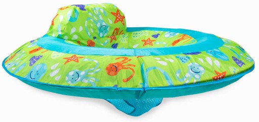 Колесо SwimWays Baby Springfloatвиробляється компанієюSpinmaster, що славиться своєю високоякісною продукцією. Понтон має сидіння з сітки з отворами для ніжок і спинку, що забезпечить комфорт дитини. Він зелено-помаранчевого кольору, на ньому зображені морські істоти. Крім того, в комплекті буде капелюх, який допоможе захиститися від сонця.