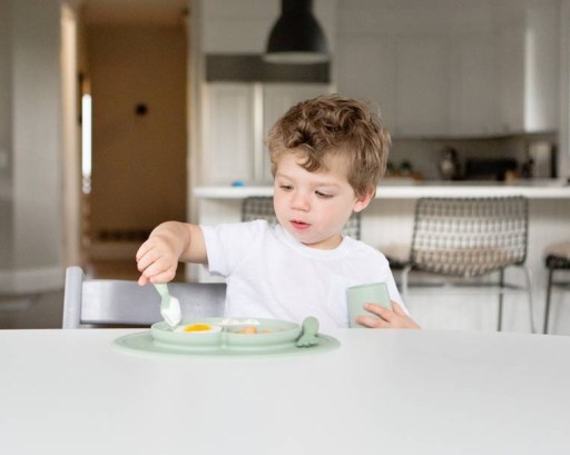 У набір силіконових столових приборів Mini Utensils входять ложка і виделка. Використання двох типів столових приборів підвищує сенсорику та підтримує розвиток мовлення та дрібної моторики, серед іншого. тренується ловити, черпати (шампуром) і кувати (вилочкою). Головки обох столових приладів мають оптимальний розмір, а три зубця вилки досить широкі, що робить набір абсолютно безпечним для малюка. М'який матеріал захищає зуби, що прорізуються, а легкий вигин допомагає навчитися змикати губи. Чотири силіконові виступи на внутрішньому краю забезпечують сенсорну стимуляцію рота та ясен/зубів, а також запобігають задусі. Відповідно короткі або товсті, округлі та протиковзкі ручки мають профіль, щоб їх було зручно тримати в руках. Додаткові виступи на нижній частині ручок стабілізують шматки при падінні.