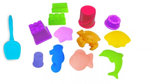 У набір входять кольорові формочки. Завдяки формочкам дитина легко створить замок або втілить найкреативніші ідеї. Пластикові форми можуть розбудити уяву і змусити окремі форми збагатити зовнішній вигляд будівлі або ... перетворитися на інгредієнти для пісочного посуду.