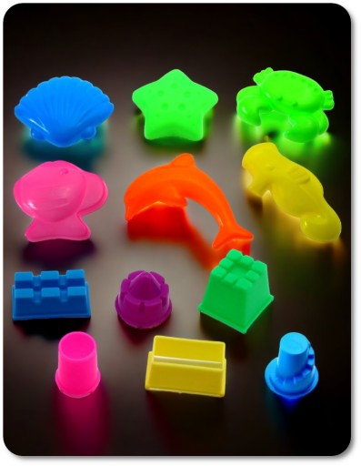 У набір входять різнокольорові формочки. Завдяки формочкам ваша дитина легко створить замок або втілить в життя найкреативніші ідеї. Пластикові форми можуть пробудити вашу уяву і змусити окремі формочки збагатити зовнішній вигляд будівлі або... перетворити на інгредієнти для пісочного посуду.
