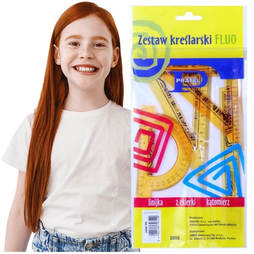 У набір для малювання входять: лінійка 16 см, косинець з масштабами 10 см і 14 см, мірка 180 градусів.